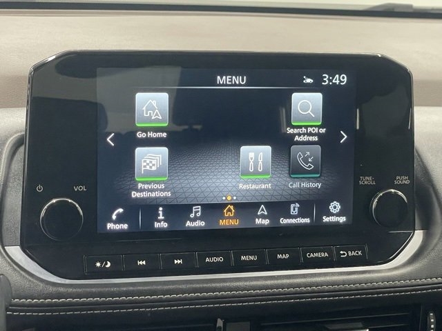 - Radio: AM/FM NissanConnect w/Navigation -inc: Nissan door to door navigation w/3D building graphics and satellite imagery featuring online POI search and online premium traffic information, SiriusXM Traffic, SiriusXM Travel Link, 9" color display w/multi-touch control, NissanConnect featuring Apple CarPlay and Android Auto, SiriusXM Satellite Radio, 2 illuminated USB connection ports (1 type-A, 1 type-C), Bluetooth hands-free phone system, streaming audio via Bluetooth and hands-free text messaging assistan